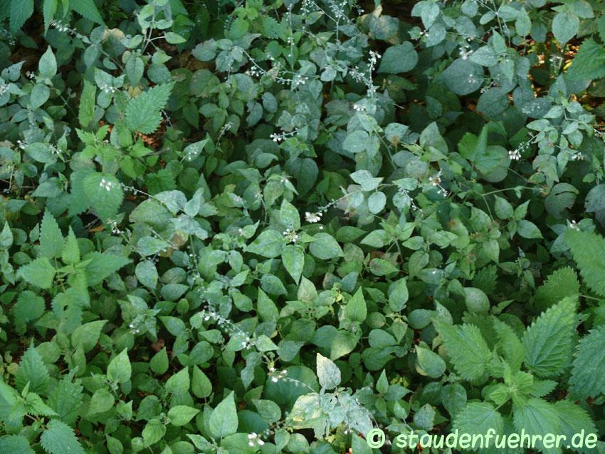Das gewöhnliche Hexenkraut (Circaea lutetiana) ist mehrjährig, gehört zu der Familie der Onagraceae (Nachtkerzengewächse) und ist eine Wildblumen Pflanze. Die Blüten sind weiss und die Blätter grün. Die mehrjährig ausdauernde krautige Pflanze (Staude) wird bis zu 20 cm hoch. Die Bodenverhältnisse sollten feucht, durchlässig sein und der Standort schattig, halbschattig.