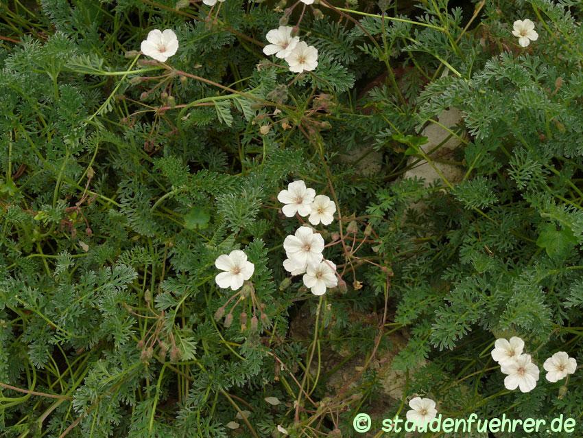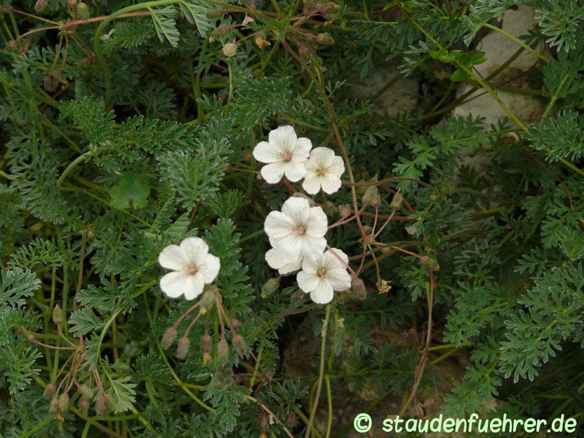 Der griechischer Reiherschnabel (Erodium chrysanthemum) ist mehrjährig, gehört zu der Familie der Geraniaceae (Storchschnabelgewächse) und ist eine Gartenbeet Pflanze. Die Blüten sind weiss und die Blätter grün. Die mehrjährig ausdauernde krautige Pflanze (Staude) wird bis zu 15 cm hoch. Die Bodenverhältnisse sollten durchlässig sein und der Standort sonnig.