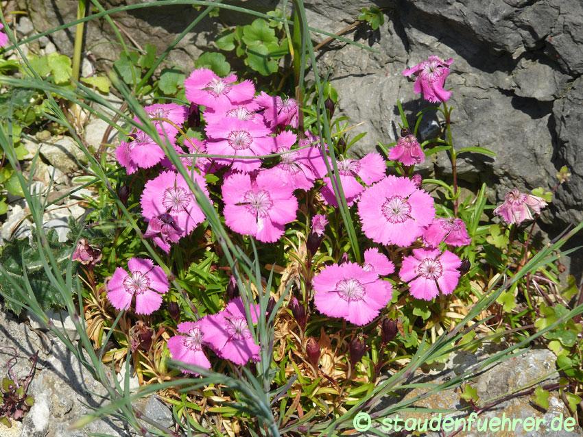 The Dianthus glacialis (Glacier carnation, Glacier pink) is perennial, belongs to the Caryophyllaceae family and is a garden bed plant. The flowers are pink and the leaves green. The herbaceous perennial plant will be under 10 cm (4 in) high. The soil conditions should be well-drained and the plant area sunny.