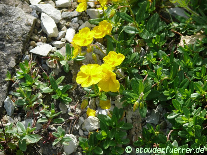 The Helianthemum nitidum (Shiny rock rose) is perennial, belongs to the Cistaceae family and is a garden bed, stone garden plant. The flowers are yellow and the leaves green. The herbaceous perennial plant will be up to 20 cm (8 in) high. The soil conditions should be dry and the plant area sunny.