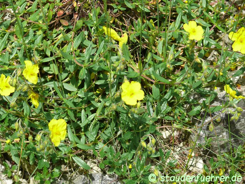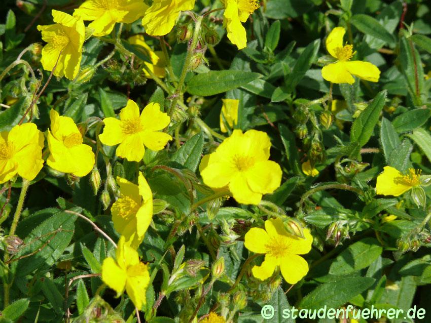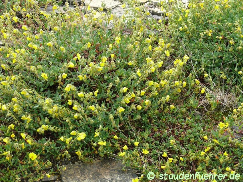The Helianthemum nummularium (Common rock-rose) is perennial, belongs to the Cistaceae family and is a garden bed, stone garden, wildflower plant. The flowers are yellow and the leaves green. The herbaceous perennial plant will be up to 15 cm (6 in) high. The soil conditions should be dry, well-drained and the plant area sunny.