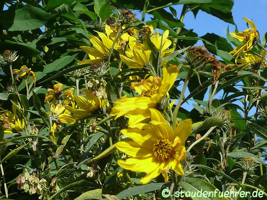 The Helianthus maximiliani (Maximilian sunflower) is annual, belongs to the Asteraceae family and is a garden bed, wildflower plant. The flowers are yellow and the leaves green. The herbaceous annual plant will be above 300 cm (9 ft) high. The soil conditions should be well-drained and the plant area sunny.