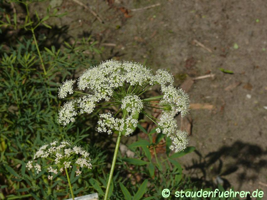 The Laserpitium siler (Laserwort) is perennial, belongs to the Apiaceae family and is a garden bed plant. The flowers are white and the leaves green. The herbaceous perennial plant will be up to 100 cm (39.4 in) high. The soil conditions should be well-drained and the plant area sunny.