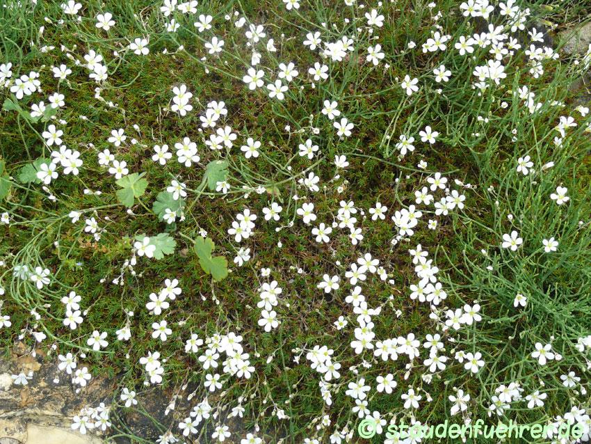 The Minuartia laricifolia (Howell's sandwort) is perennial, belongs to the Caryophyllaceae family and is a stone garden plant. The flowers are white and the leaves green. The herbaceous perennial plant will be up to 20 cm (8 in) high. The soil conditions should be dry and the plant area sunny.