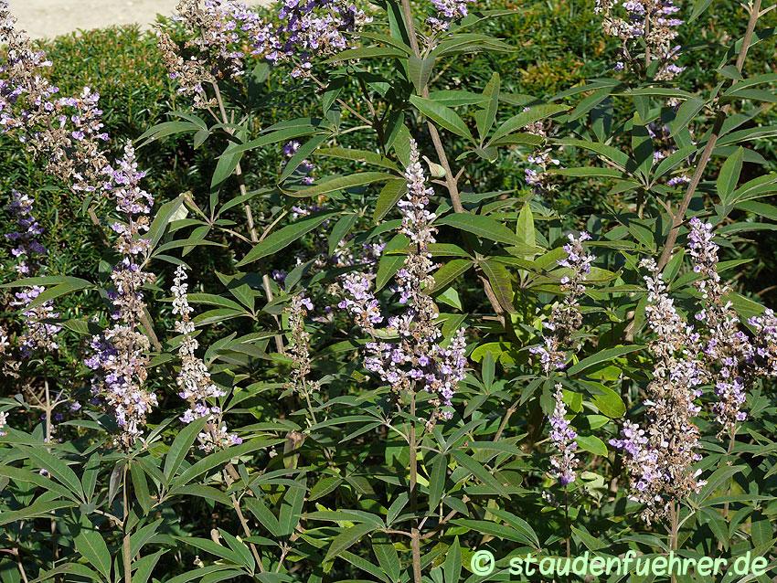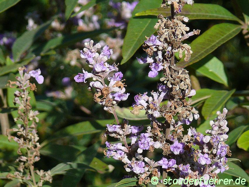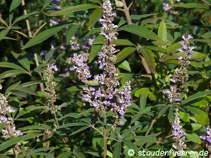 The Vitex agnus-castus (Vitex, Chaste tree, Chasteberry, Monk's pepper) is perennial, belongs to the Lamiaceae family and is a garden bed plant. The flowers are purple, pink and the leaves green. The shrub will be above 400 cm (13 ft) high. The soil conditions should be well-drained and the plant area sunny, half-shady.